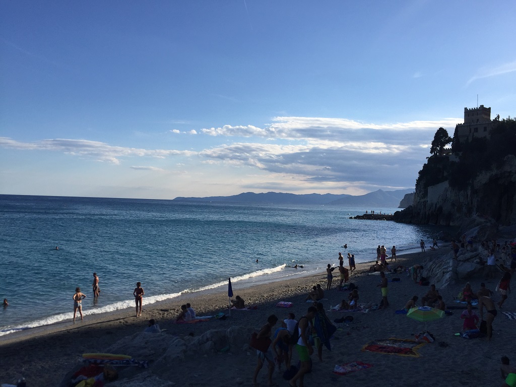 Die dritte und letzte Station führte uns an die ligurische Mittelmeerküste, auf den Campingplatz Camping Tahiti in Finale Ligure. Der Strand, parallel zur Flaniermeile, ist angefüllt mit sehr teuren Liegen, Zäunen und Stammgästen. Links davon gibt es jedoch einen Küstenstreifen der kostenlos und zaunfrei ist; wenn auch etwas voll.